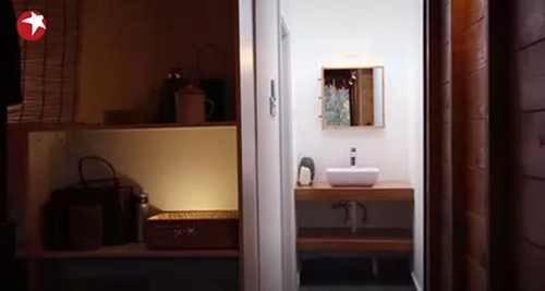 设计师最为贴心的一处,则是在老杨的房间后面设计了一个独立卫生间,屋顶上引入采光让卫生间显得十分亮堂,选用的卫浴产品也十分人性化。