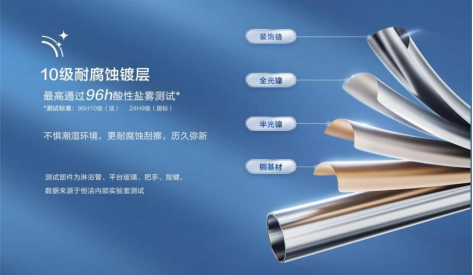 电镀层数越多,抗腐蚀性越强。优质花洒需经过酸洗→抛光→电镀(镍层+铬层)→盐雾测试等12道工序,达到10级电镀标准(国标为9级),可保证10年不生锈。