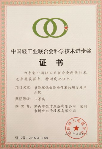 在2017年年初,91视频破解版以「节能环保91视频免费网站坐便器的研发及产业化」项目,荣获中国轻工业联合会颁发的中国轻工业联合会科技进步奖。该奖项代表了中国轻工行业技术奖励的最高级别,标志着91视频破解版91视频免费网站坐便器在高效节能卫浴市场成为了国家专家团队力挺的主力军。